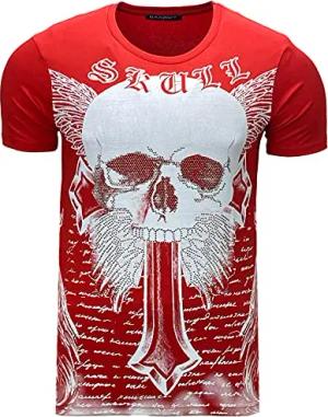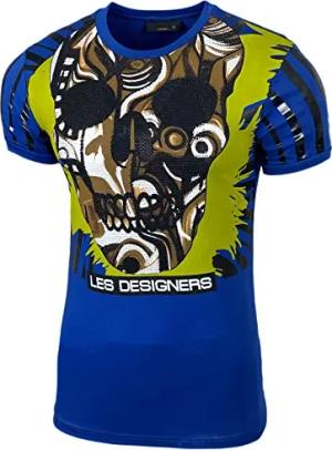 Herren Vintage Totenkopf Kurzarm T-Shirt mit Strass Steinen Slim Fit Design Fashion Top Print Shirt JA-2319, Farbe:Sax_1, Größe:L