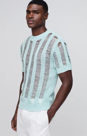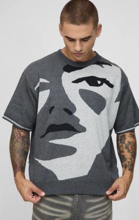 Oversized Boxy Face Jacquard Knitted T-Shirt - Black - M, Black