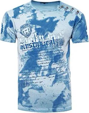 T-Shirt Herren Schwarz S - 3XL Kurzarm Rundhals Knopfleiste Seitliche Front Prints Tshirt Verwaschen 241, Farbe:Blau, Größe S-3XL:M