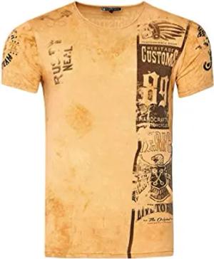 T-Shirt Herren Schwarz S - 3XL Kurzarm Rundhals Knopfleiste Seitliche Front Prints Tshirt Verwaschen 241, Farbe:Camel, Größe S-3XL:XL