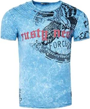 V-Neck Herren T-Shirt Vinatage Used-Look mit Plakativem Front und Back Print Kurzarm-Shirt Wildleder-Details mit Nieten-Verlauf 289, Farbe:Blau, Größe S-3XL:L