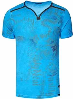 V-Neck Herren T-Shirt Vinatage Used-Look mit Plakativem Front und Back Print Kurzarm-Shirt Wildleder-Details mit Nieten-Verlauf 289, Farbe:Blau, Größe S-3XL:XL