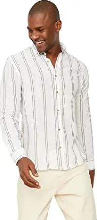 MAN Herren Trendyol Men's Slim Fit Button Collar Thin Striped Shirt, Khaki, S EU