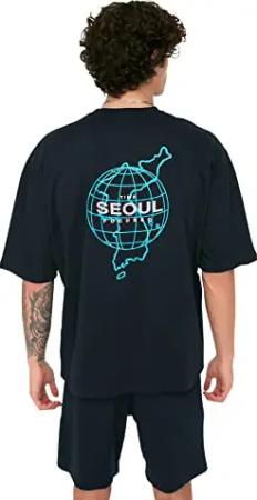 Man Menswear Oversize Standard Crew Neck Woven T-Shirt Navy Blue