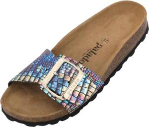 Pantoletten Damen Samos EGS - bequeme Sandalen Made in Spain - Hausschuhe mit dämpfendem Kork-Fußbett - modische Sommerschuhe Flieder Metallic UK3,5 - EU36