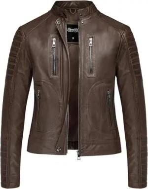 Damen Echtleder Jacke Biker Zipper Lederjacke RJ-8009 Dunkelbraun XL