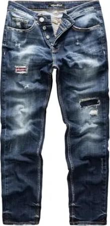 Herren Jeans Regular Straight Fit Denim Hose Destroyed Dunkelblau (Patches) W38/L30