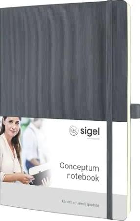 CO318 Notizbuch A4 kariert grau, Softcover, 194 nummerierte Seiten, nachhaltiges Papier, mit Inhaltsverzeichnis, Stiftschlaufe, Falttasche, Gummibandverschluss, Conceptum