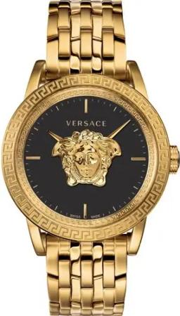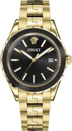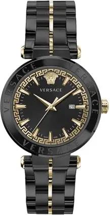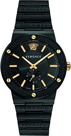 Greca Logo Collection Luxuriöse Herren-Armbanduhr mit einem schwarz/goldenen Armband mit einem IP-Schwarz/IP-Gelbgold-Gehäuse und schwarzem Zifferblatt, Schwarz, OS, Versace Greca-Logo
