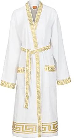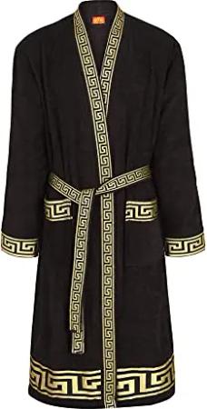 Bademantel aus Frottee 100% Baumwolle mit 2 großen Vordertaschen im exklusivem Mäander Medusa Design für Damen und Herren Schwarz Weiss Gold (as3, alpha, s, regular, regular, schwarz)