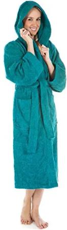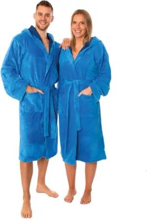 Bademantel mit Kapuze aus 100% Baumwolle – Frottee Saunabademantel für Damen & Herren – kuschelig, saugstark & lang – Serie Berlin Farbe taubenblau Größe S/M