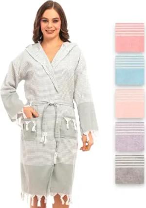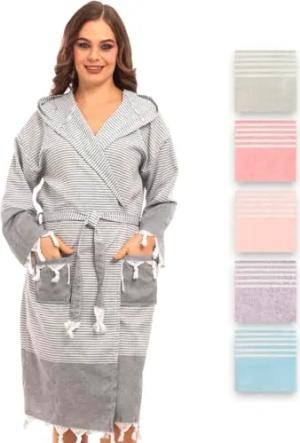 Bademantel aus Hamamtuch, Saunatuch, Sauna bademantel damen für ultimativen Luxus, mit Gürtel & Kapuze - Langform Frauen (S-M, Khaki)