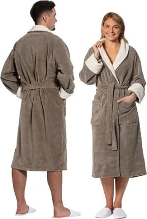 Bademantel mit Schalkragen aus 100% Baumwolle – Frottee Saunabademantel für Damen & Herren – kuschelig, saugstark & lang – Serie Berlin Farbe cappuccino Größe L/XL