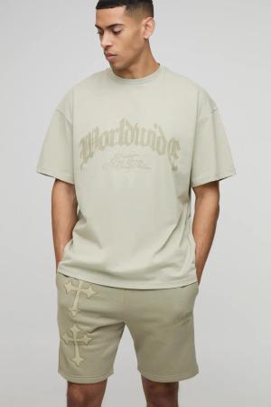 Oversize T-Shirt & Shorts mit Kreuz-Applikation - Grün - S, Grün