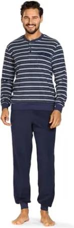 Herren Schlafanzug Frottee Langarm Knopfleiste 242822 Farbe: Indigo Gestreift Frottier Gr. 56