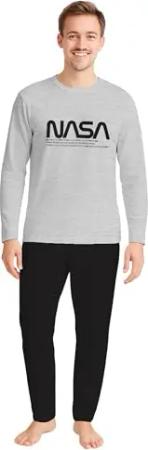 NASA Schlafanzug für Herren Pyjama Set Langarm Oberteil mit Hose Grau/Schwarz (DE/NL/SE/PL, Alphanumerisch, L, Regular, Regular, Grau/Schwarz)