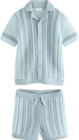 Jungen Standard Kurzarm-Hemd mit Häkel- + Strickdetails und Shorts Blau 104-110