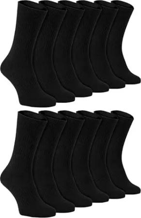 12er Pack Herren 100% Baumwolle Socken in Schwarz Atmungsaktiv Crew Extra Weit Socken Ohne Gummi (39-45, TSFD02)
