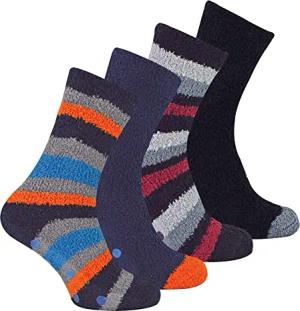 4er Pack Herren Kuschelsocken mit Noppen Warme Rutschfest Stoppersocken | Antirutsch Flauschige Bettsocken (39-45, Schwarz/Orange -Streifen)