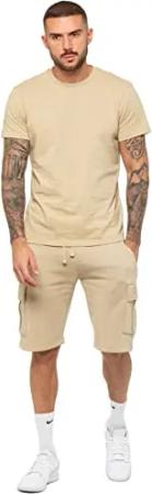 Herren-Trainingsanzug-T-Shirt-Shorts, normale Passform, einfarbiges T-Shirt, Rundhalsausschnitt, lässig, Fleece-Cargo-Shorts, stone, S