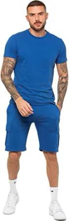 Herren Trainingsanzug T-Shirt Shorts Set Regular Fit Einfarbig Tee Rundhals Top Casual Fleece Cargo Shorts, blau, S