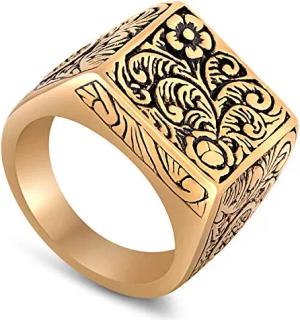 Floris Ring | Design-Ring Frauen Herren Edelstahl Groß Floral Blumen Ornament Siegel - Gold - US 7