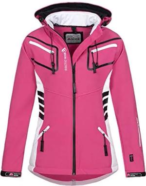 Damen Softshell Funktions Outdoor Regen Jacke Sport Kapuze AS185 [AS-185-Rosa-Weiss-Gr.S]