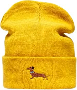 Beanie - „Dackel“ - Bestickte Strickmütze für Herren & Damen - Warme Wintermütze (Senfgelb)