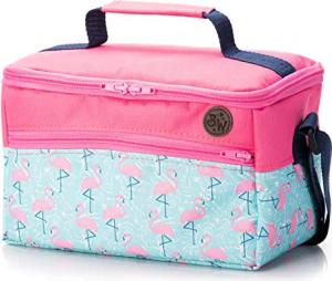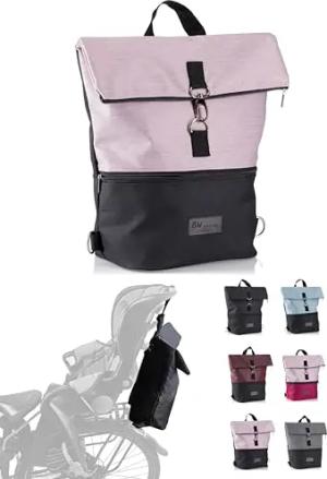 BambiniWelt Fahrradtasche – Rucksack für Kinderfahrradsitz kompatibel mit Römer Jockey, wasserabweisend, mit Klickverschluss & Schultergurt, 20 l Stauraum (schwarz-rosa)