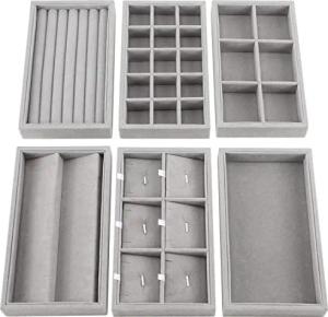 6er Pack Stapelbarer Schmuck Organizer aus Grauem Samt - Schmuckeinsatz für Schubladen in 6 Verschiedenen Designs - Insgesamt 36 Fächer für Ringe, Armbänder, Ohrringe & Ketten Aufbewahrung