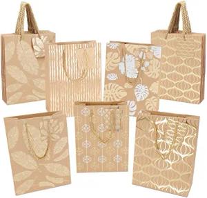 Braune Geschenktüten Papier mit Gold & Silber Metallic Design, Golden gedrehte Henkel & Etiketten (15 Pack) Kraftpapier Geschenktüten 18 x 8,5 x 24 cm für Geburtstag, Hochzeit, Baby Shower