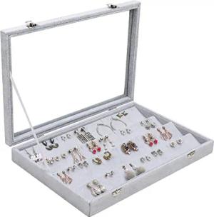 Jewelry Organizer Ohrringe Schmuckkasten Grau, Samt Box Deckel & 40 Schlitze – Schmuckaufbewahrung 4 Ebenen Schmuckschatulle mit Sichtfenster als Ohrring Halterung, Ohrstecker Aufbewahrung