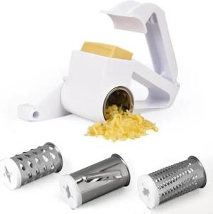 Käsereibe mit Kurbel - Lebensmittelreibe und 3 Edelstahltrommeln - Vielseitige Gemüsereibe mit Griff - Kartoffelreibe für Rohe Kartoffeln - Apfelreibe - Nussmühle