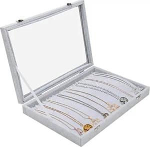 Schmuck Aufbewahrung mit 20 Haken & Abschließbaren Glasdeckel, Stapelbare Schmuckaufbewahrung Grau Samt Schmuckkästchen für Ketten, Armband Aufbewahrung & Schmuckaufbewahrung Ohrringe