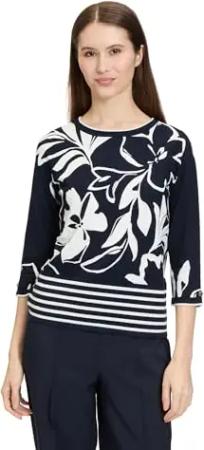 Damen Feinstrickpullover mit Blumenprint 40, Dunkelblau/Weiß