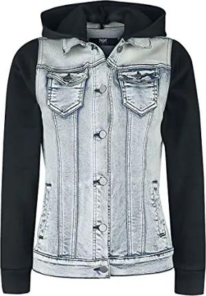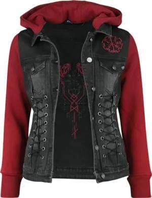 Damen schwarz-rote Jeansjacke mit abnehmbarer Kapuze und Ärmel aus extra weichem Sweat-Stoff M