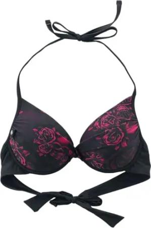 Damen schwarzes Bikinioberteil mit Totenkopf und Rosen Motiv XXL