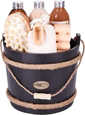Cosmetics Wellness Badeset - Kokosnuss- 9-teiliges Geschenkset mit Pflege- und Massage Accessoires im dekorativen Badefass