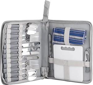 Outdoor Picknick Besteckset mit Schneidebrett und Flaschenöffner für 4 Personen Camping und Reisen - Platzsparend im Etui 23 × 4 × 29 cm - Grau