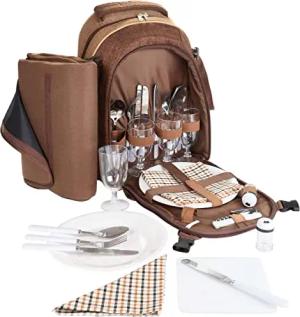Picknickrucksack für 4 Personen Braun 28,5 × 42,5 x 19 cm - inkl. Kühlfach + Fleece-Picknickdecke mit wasserfester Unterseite