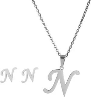 Silberfarbenes Schmuckset Letter aus Edelstahl für Damen - 1 Paar Ohrstecker & Kette mit Buchstabe nach Wahl (N)