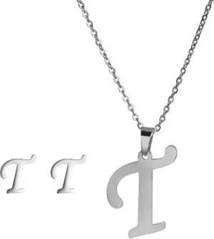 Silberfarbenes Schmuckset Letter aus Edelstahl für Damen - 1 Paar Ohrstecker & Kette mit Buchstabe nach Wahl (T)