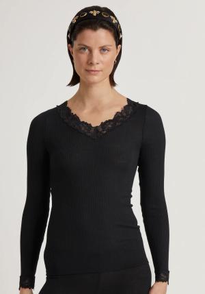 Richesse Lace T-Shirt Damen, aus Schurwolle und Seide mit Spitze am Ausschnitt, Feinripp im Rundstrick ohne störenden Seitennähte, temperaturausgleichend