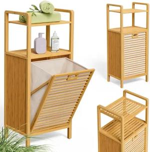 2er Set Badregal mit Wäschekorb 80 L Wäschesammler Bambus Holz 96x40x30cm Wäschesack Herausnehmbar Badezimmerregal 2 Ablagen Wäschebox Regal