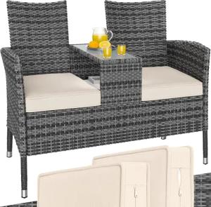 Gartenbank Sitzbank inkl. Auflagen Wetterfest Polyrattan 320kg Belastbar Tisch Ablage UV-beständig Garten Balkon Bank 2-Sitzer 143x55cm Grau