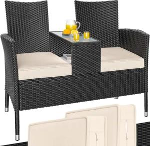 Gartenbank Sitzbank inkl. Auflagen Wetterfest Polyrattan 320kg Belastbar Tisch Ablage UV-beständig Garten Balkon Bank 2-Sitzer 143x55cm Schwarz