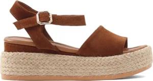 Damen Sandalen Sommer elegant – Geflochtene Keilsandalen mit Bastsohle, offene Zehen, bequemer Absatz, luftige Sommerschuhe aus Wildleder in Cognac