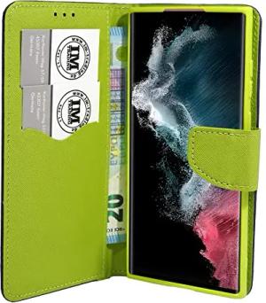 Buch Tasche Fancy kompatibel mit Samsung Galaxy S24 Ultra Etui mit Standfunktion, Kartenfach Blau-Grün