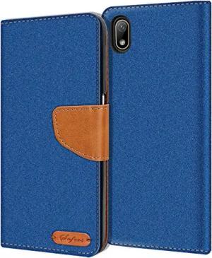 Handyhülle Stoff für Huawei Y5 2019 Textil Wallet Case, Stoff-Design mit Magnetverschluss & Kartenfächern, kompatibel mit Huawei Y5 2019 (5,7 Zoll), Blau