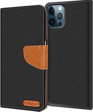 Handyhülle Stoff für iPhone 12/12 Pro Textil Wallet Case, Stoff-Design mit Magnetverschluss & Kartenfächern, kompatibel mit iPhone 12/12 Pro (6,1 Zoll), Schwarz